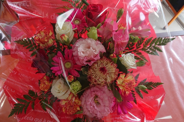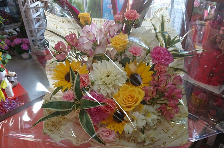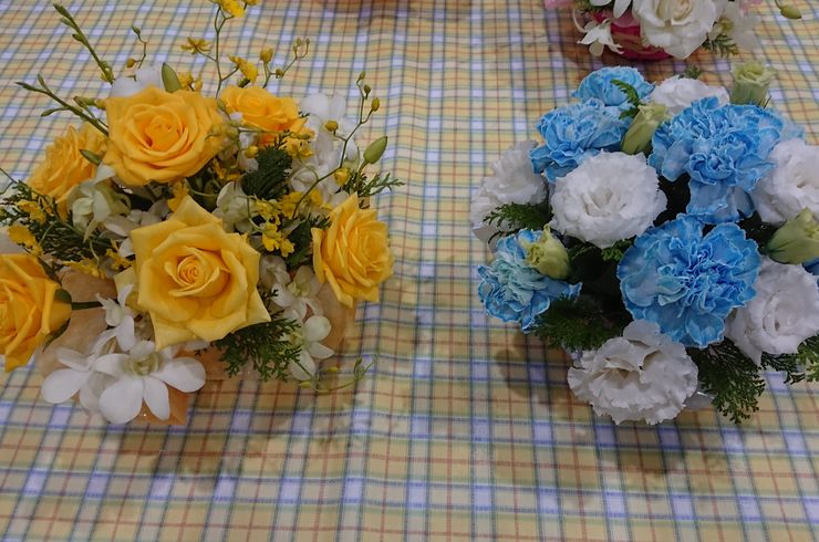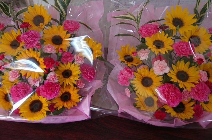 ひまわりとカーネーションのみで明るく作って欲しいとのご要望に応じてお作りしています。